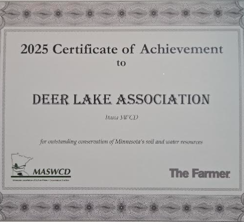 The “Deer Lake Station” was created in 2019 due to the efforts of former DLA President John Davis, to ensure that boaters had convenient access to the proper tools needed to decontaminate their watercraft when entering or exiting area lakes. The Deer Lake Association has also been very active in the control of the Curly Leaf Pondweed (CLP) population discovered on the lake in 2020 through hand-removal of the plants, as well as limited granular herbicide applications. For many years neighbor Jon Arsenault volunteered to scout the Access Bay for CLP by scuba. Chris Evans has been the leader of the Control and Monitoring crew from SWCD, and has worked closely with the DLA. The Itasca SWCD is proud to recognize and celebrate the Deer Lake Association’s ongoing commitment to stewardship, collaboration, and environmental resilience.