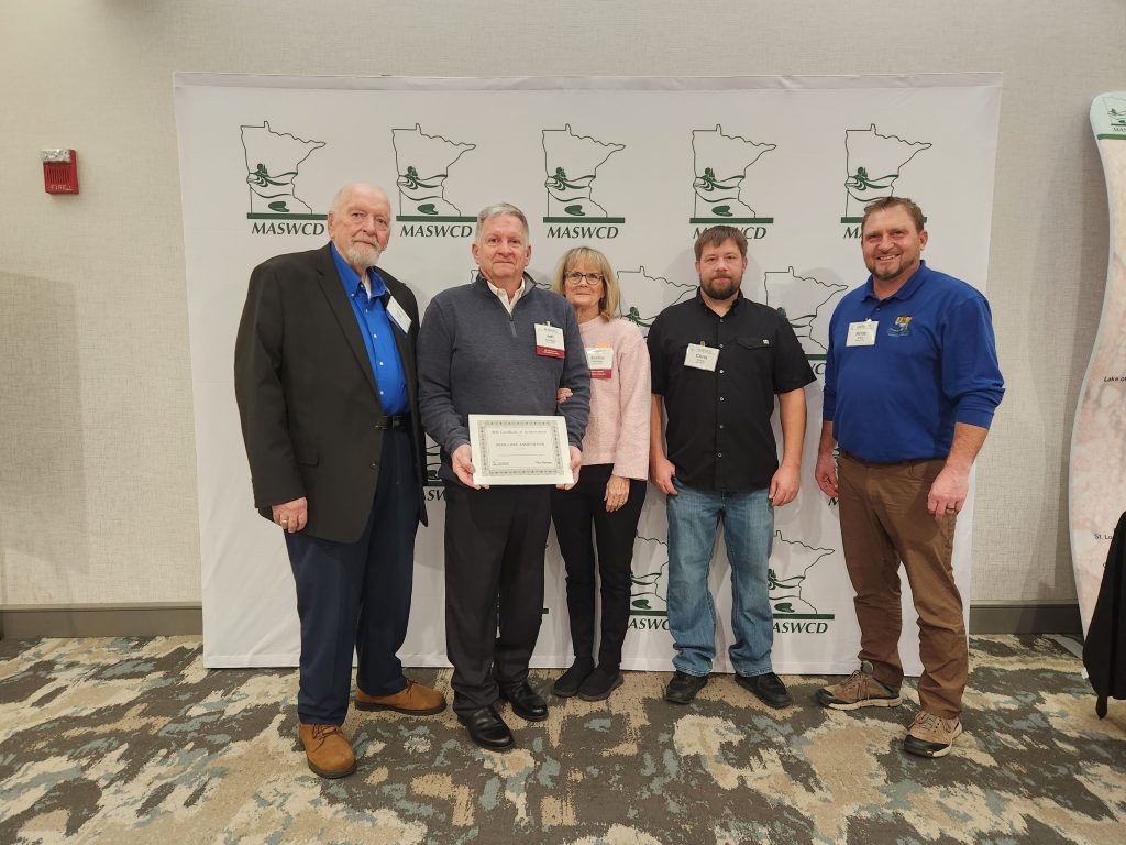 Pictured above at the award ceremony at the Minnesota Association of SWCDs, are Itasca SWCD Board Chairman Calvin Sarri, Jeff and Jackie Johnson, Chris Evans, and Andy Arens, Itasca SWCD Manager.
